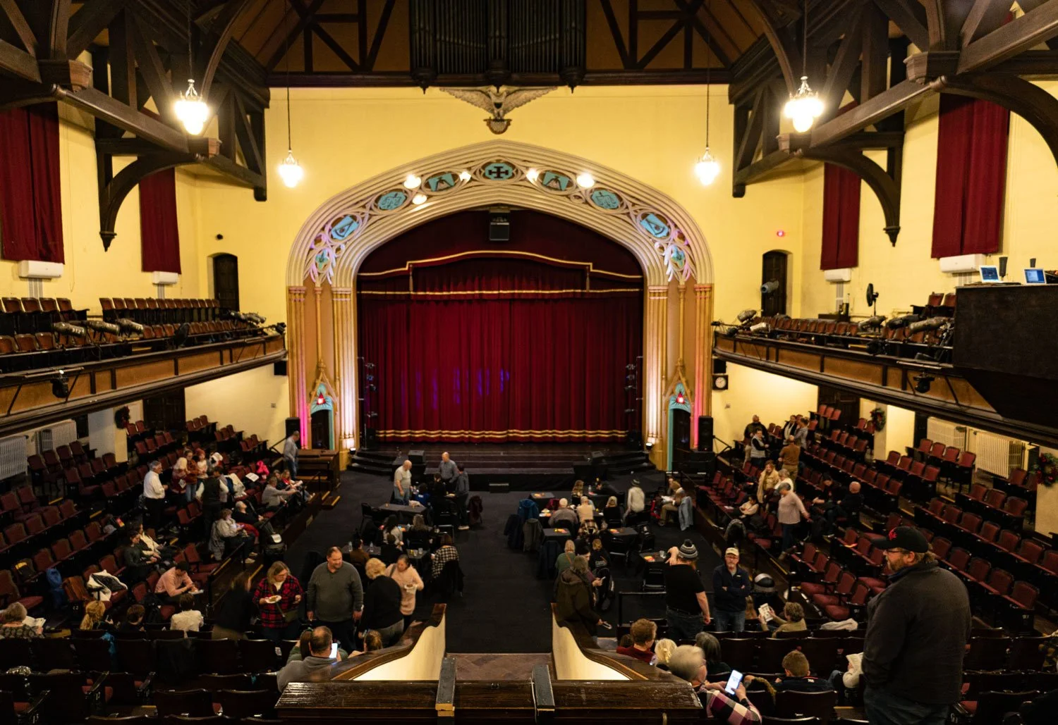 The Tubbs’ came into this space after a chance encounter with Adam Bain, the co-owner of the building. Sarah and Adam had known each other since their days at Rocky and happened to cross paths again while Bain was searching for someone to fill the theater space and bring some much-needed life to this nearly century-old Moline landmark. Complete with original stained-glass lining the balcony the atmosphere of this space is unlike anything else in the QCA. It’s a genuine experience attending an event here that extends beyond the performers on stage, whether that stage is the home for a candle-lit concert, a classic musical like Annie, or a Christmas performance full of local musical icons. The building also houses The Spotlight Studio, the current home of ComedySportz, and a more intimate space with performances that are quite a shift from the more elaborate shows seen on the Spotlight’s main stage.