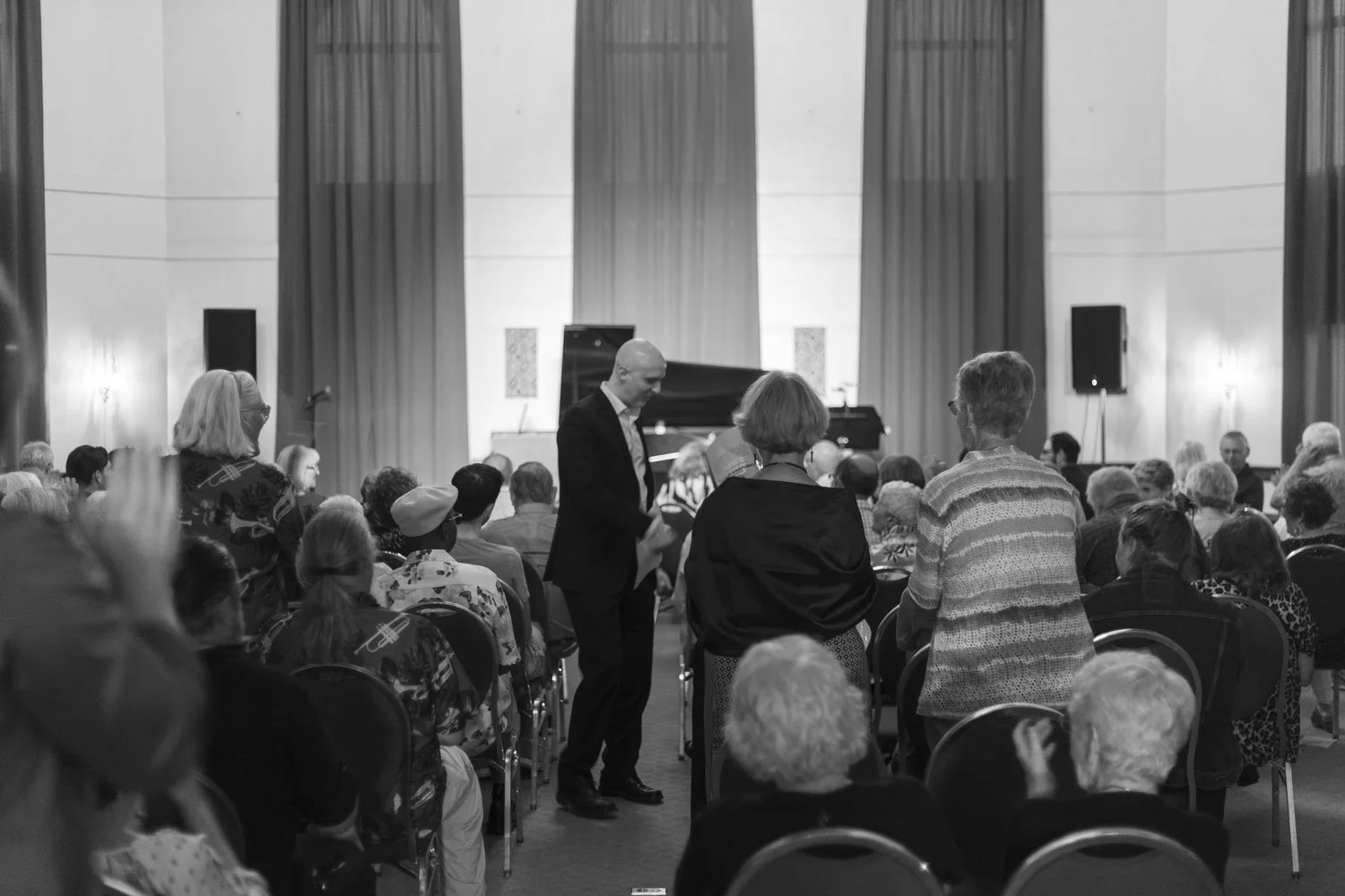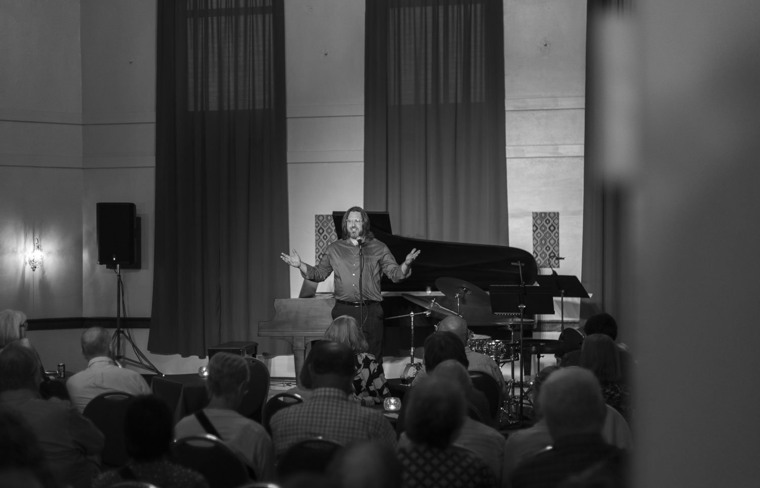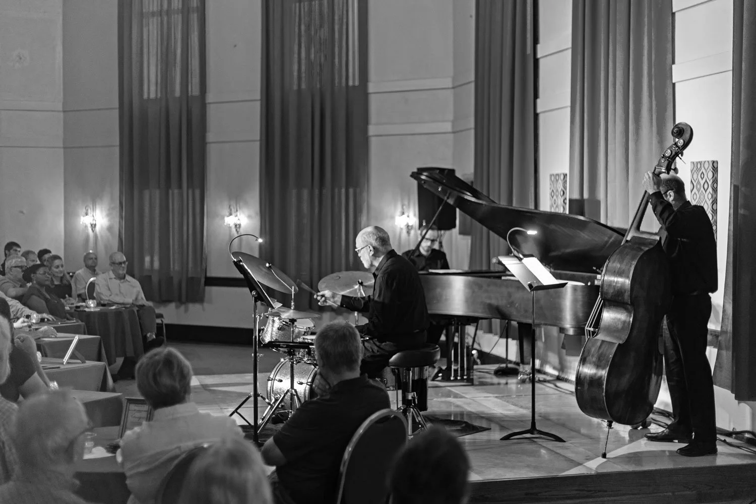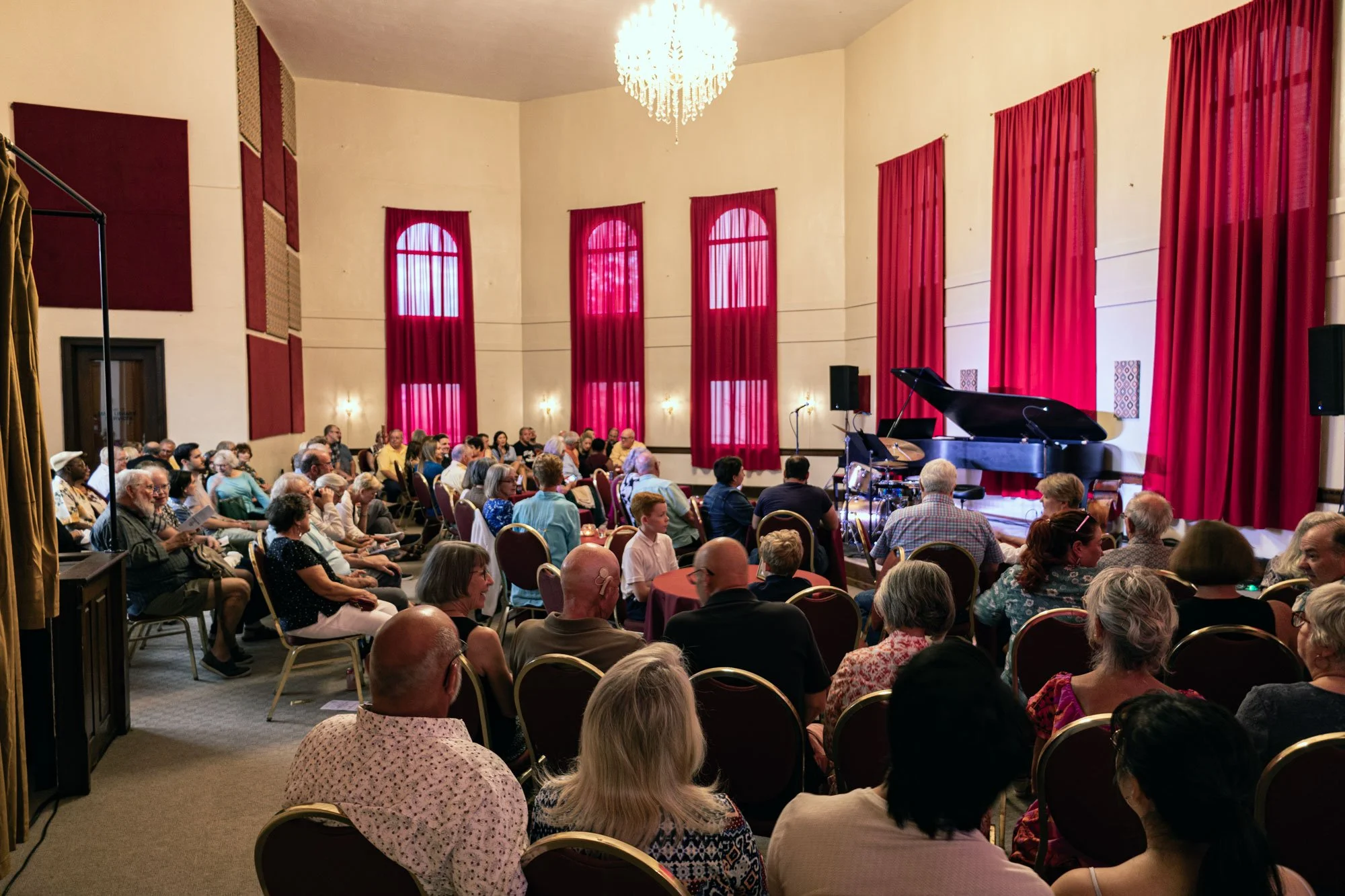 This strength is clear the minute you set eyes on the building, which was built at least a decade before anyone I’ve personally met in my lifetime. The grandiose nature of this nod to neoclassical architecture greets you with a quartet of massive stone columns and ornate fixtures, illuminating a grand staircase that ushers people inside, beyond the well-dressed revelers standing upon the steps during intermission singing their praises and commenting on how they didn’t know such sounds could be experienced here in the cities where the Mississippi bends but refuses to break. The main performance space, which holds up to 200 for fully seated events and 150 when it includes a few tables was sold out for the Saturday night celebration of famed American composer, George Gershwin. With crimson-tinged drapes bleeding over windows stretching up towards the ceiling this vaulted space truly allows room for the music to expand upon itself, making sure there isn’t a bad seat in the house to be had.